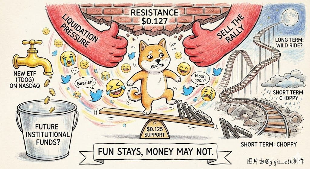 我个人认为,$0.126-$0.127的阻力非常顽固,因为这里聚集了大量短期套牢盘和杠杆空头,只要没有强力外部催化剂(如Elon Musk发推或重大利好),反弹很难持续