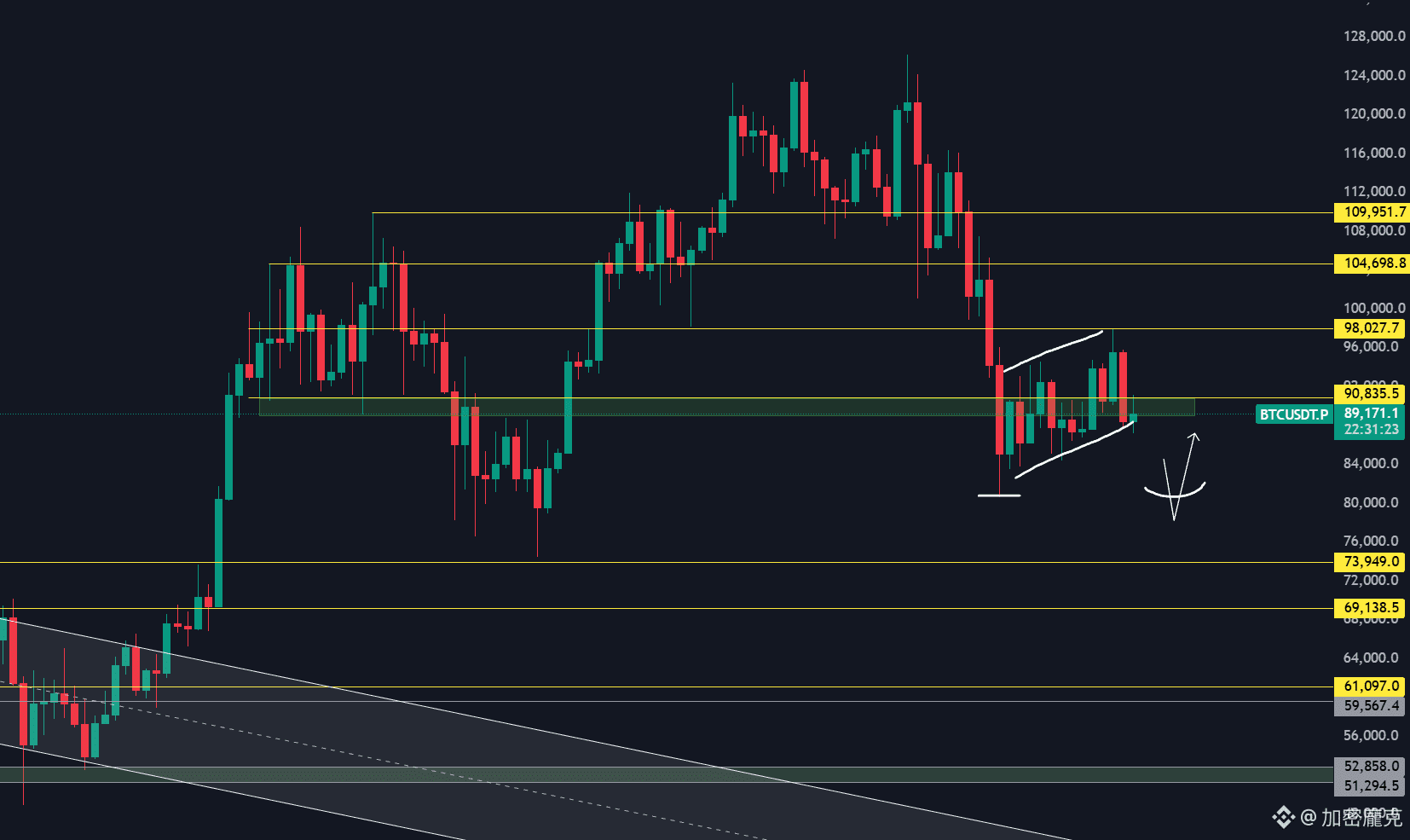 技術面:直接來講重點,下周消息會帶來的不確定性非常高,比特幣按兵不動就是在等美股反應,目前價格仍然尚未收復回90800關鍵位之上,這裡會是非常重要的防守點位