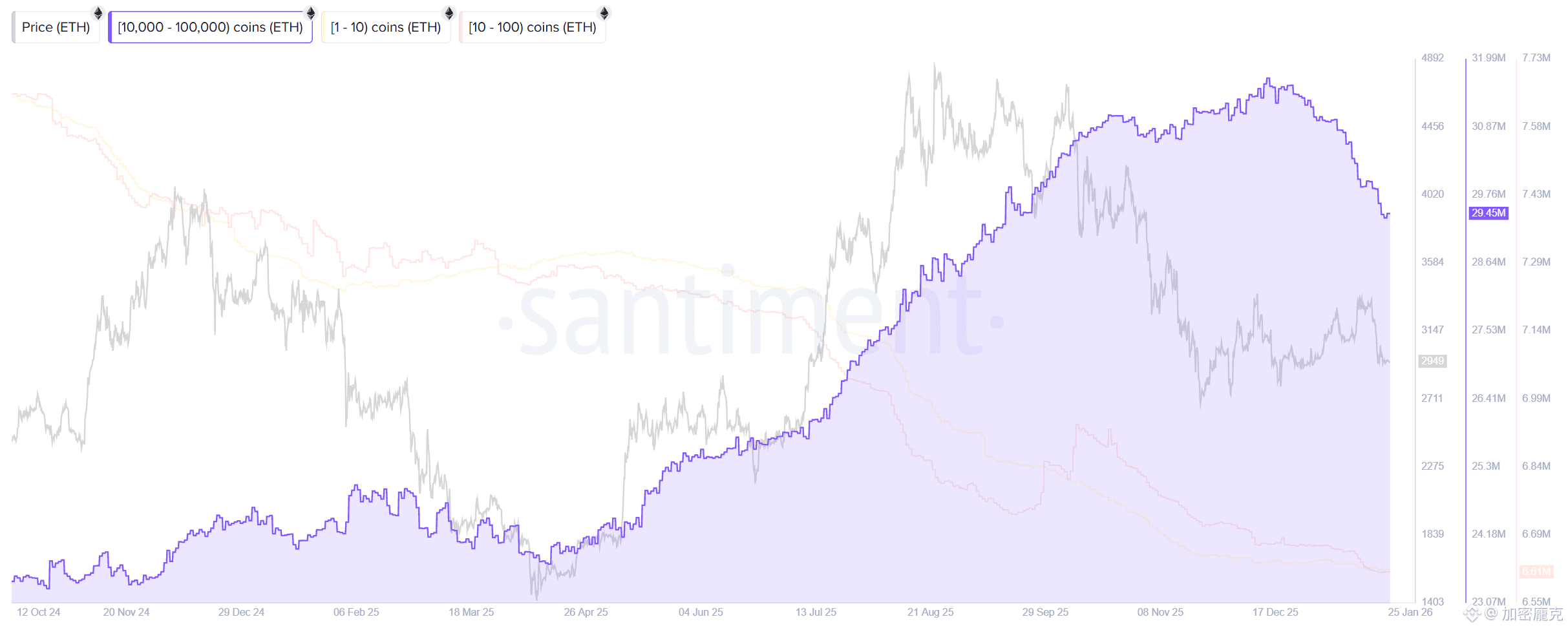 另外目前(10,000~100,000)大鯨魚持有總量如同預期持續下降當中,不過本周的下降是超出了Bitmine的質押數量了,目前Bitmine一共質押大約1.94M顆ETH,但大鯨魚持有總量是下降了2.1M左右,也就是說如果不算上Bitmine質押的ETH,還多減少了15萬顆,主要可能還是市場太多的不確定性造成的