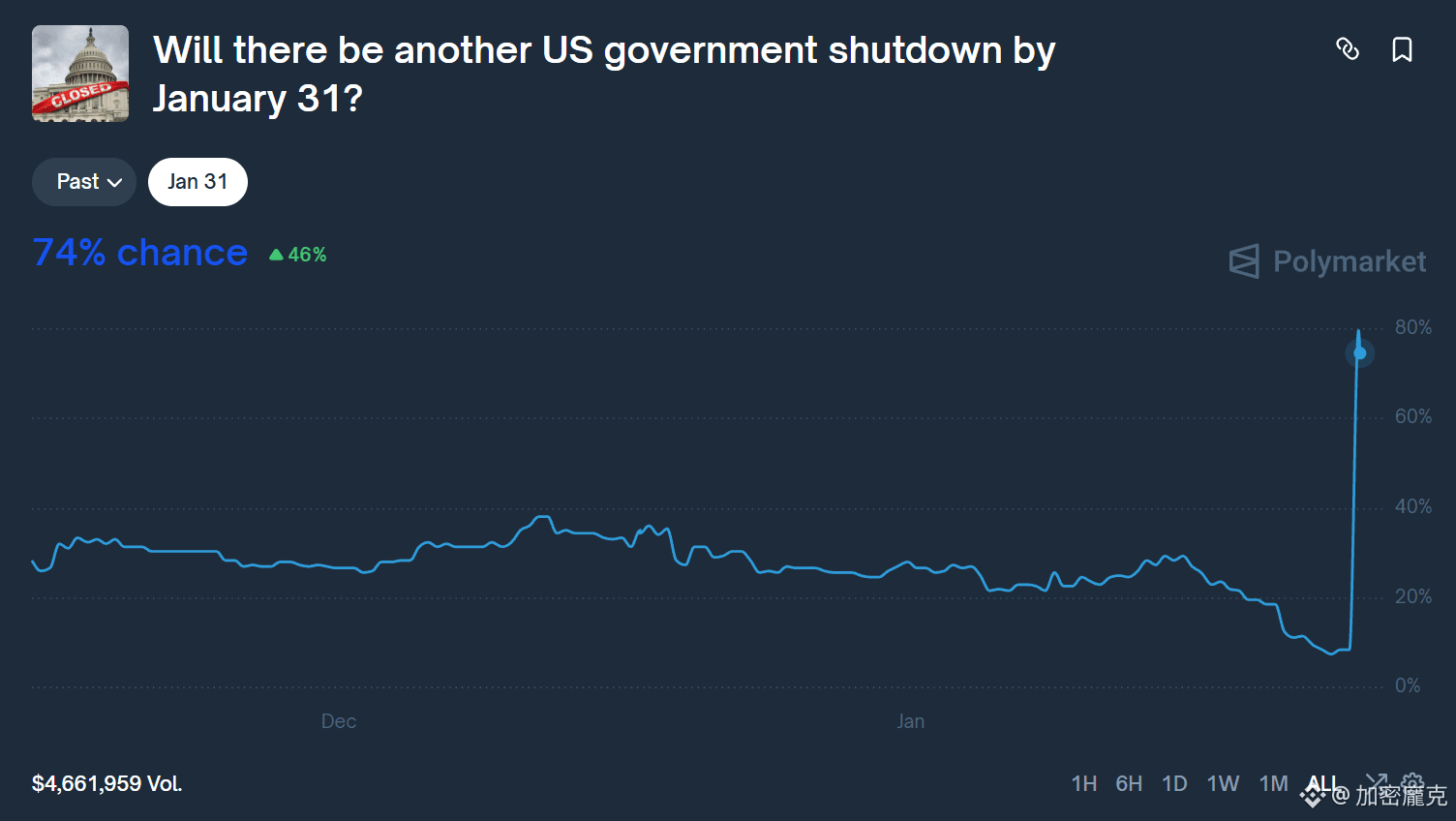 Polymarket上的政府關門機率已經飆升到74%了,這可能會是下周最大的一個不確定性,如果美國政府再次關門的話,市場流動性會再次受到衝擊