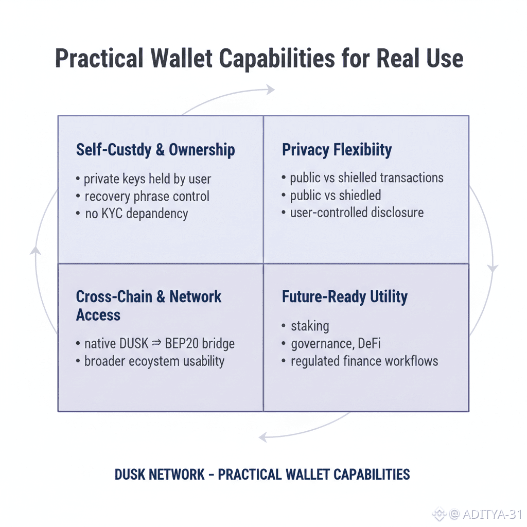 Dusk ecosystem me wallet ek optional cheez nahi hai. Ye tumhe tokens par full self-custody deta hai, privacy aur public transactions ke beech choice deta hai, bridge aur cross-chain access unlock karta hai, aur future features jaise staking, governance aur DeFi ke liye base ready karta hai.
