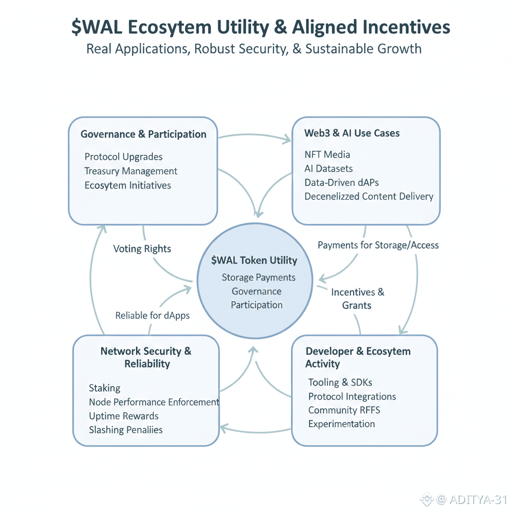 Is poore ecosystem ko power karta hai native token $WAL. WAL ka role sirf trading ya speculation tak limited nahi hai. Ye storage payments, staking, network security aur governance sab me actively use hota hai. Users WAL ke through storage pay karte hain, node operators aur delegators network ko secure rakhne ke liye rewards earn karte hain, aur token holders protocol decisions me participate kar sakte hain. Agar koi node network ke standards par perform nahi karta, to penalties bhi apply hoti hain, jisse overall network health maintain hoti hai.
