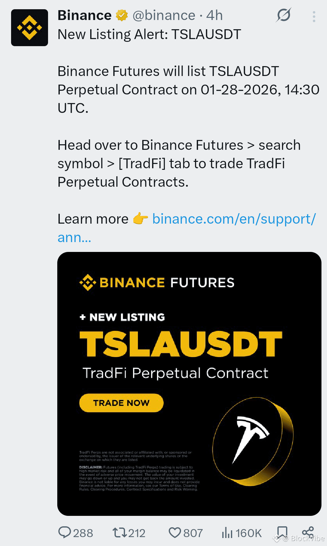 I have been in the crypto space for a long time and I never thought I d see the day where I could trade Tesla ($TSLA) directly from my Binance Futures account. But itâs finally happening on January 28, 2026.