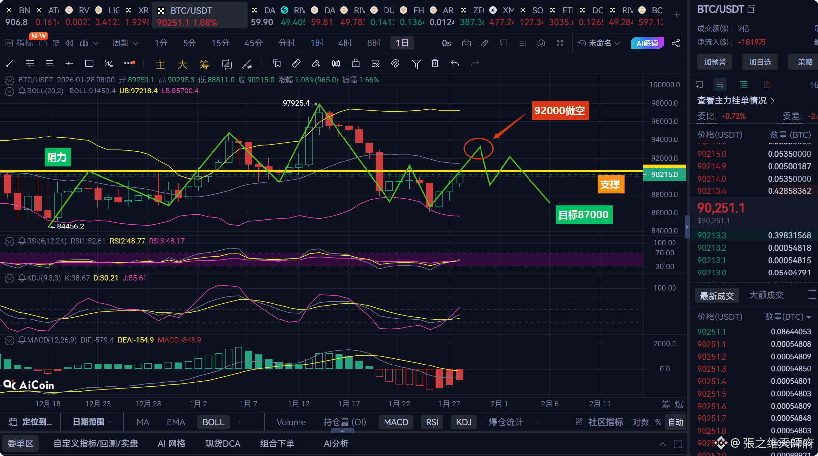 我给大家讲个去年的案例:去年 12 月 BTC 在 85000-90000 区间震荡了整整一周,当时很多粉丝慌得不行,要么追涨被套,要么割肉踏空。我当时在社群里反复强调 “支撑位低吸,阻力位高抛”,让大家在 87000 附近分批建仓,92000 附近减仓,最后不少人在震荡里赚了 15% 的波段利润。现在的行情和当时如出一辙:上方 92000 是反复试探的阻力位(图里标了 “92000 做空”),下方 87000 是关键支撑(图里绿色 “目标 87000”),只要不突破这个区间,咱们就按震荡思路操作。