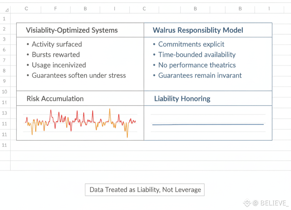 There’s also a philosophical difference at play. Many storage networks treat data as an asset to be leveraged. Walrus treats data as a liability to be honored. That flips incentives. The goal isn’t to maximize how much data enters the system. It’s to ensure that whatever does enter is treated correctly for as long as promised.