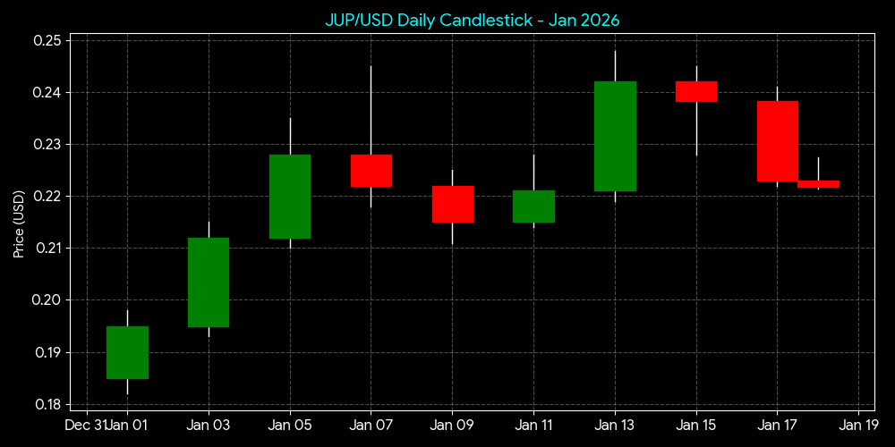 JUP a récemment rompu une tendance baissière à moyen terme. Il a un fort support à $0.210 et fait face à une résistance significative à $0.245.
