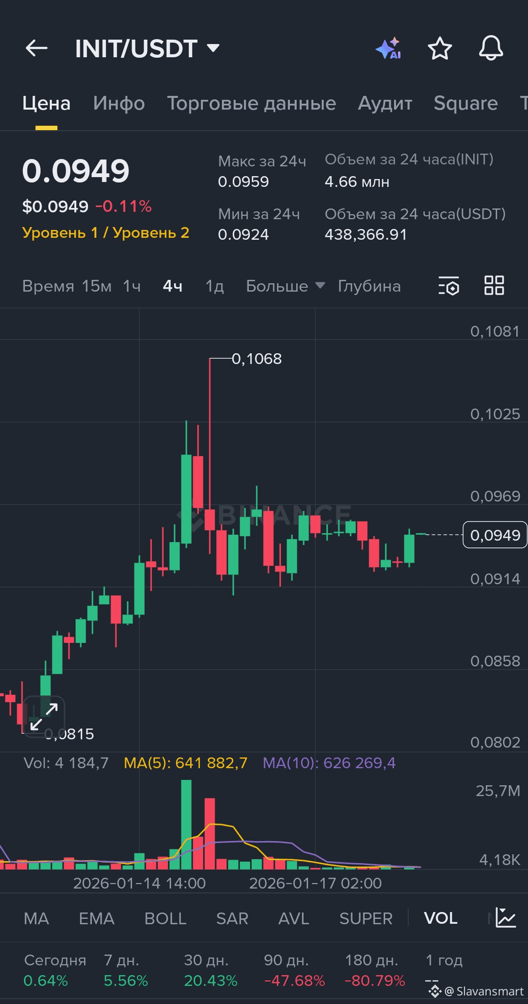 $INIT обладает относительно небольшой ликвидностью по сравнению с крупными альткоинами, из-за чего цена более чувствительна к крупным ордерам и быстро меняется.