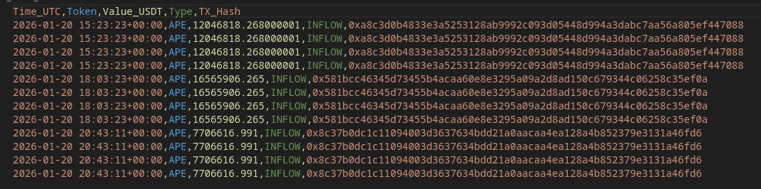 Conclusion : Cela ne semble pas être une coïncidence. Quelqu'un "dépose" activement des tokens sur la bourse. En général, un Inflow massif indique un désir de vendre (réalisation de bénéfices), ou une préparation à un grand market-making. Attendez-vous à une volatilité accrue sur APE.