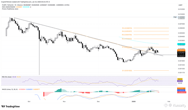 فشل ارتفاع $PUMP من خط الاتجاه الهابط الذي يربط بين قمتي 18 سبتمبر و6 يناير في تجاوز نقطة المحور R1 عند 0.002983، وعاد إلى منطقة الاختراق.