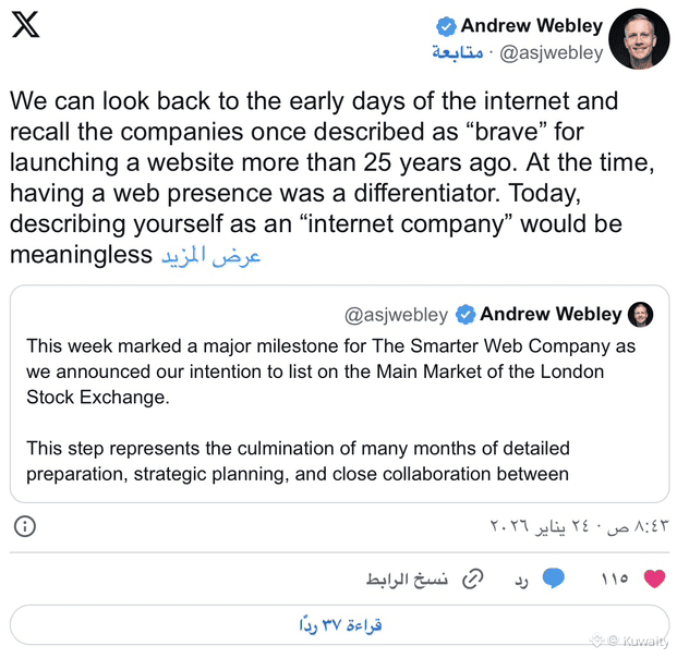 قال أندرو ويبلي، الرئيس التنفيذي لشركة The Smarter Web Company، إن الشركات تدخل مرحلة جديدة. وفي منشور حديث، شبّه التحول الحالي نحو رأس المال الرقمي ببدايات الإنترنت. في ذلك الوقت، كان امتلاك موقع إلكتروني يبدو خياراً إضافياً. اليوم، أصبح أمراً أساسياً. ويرى ويبلي أن رأس المال الرقمي سيسلك المسار نفسه.
