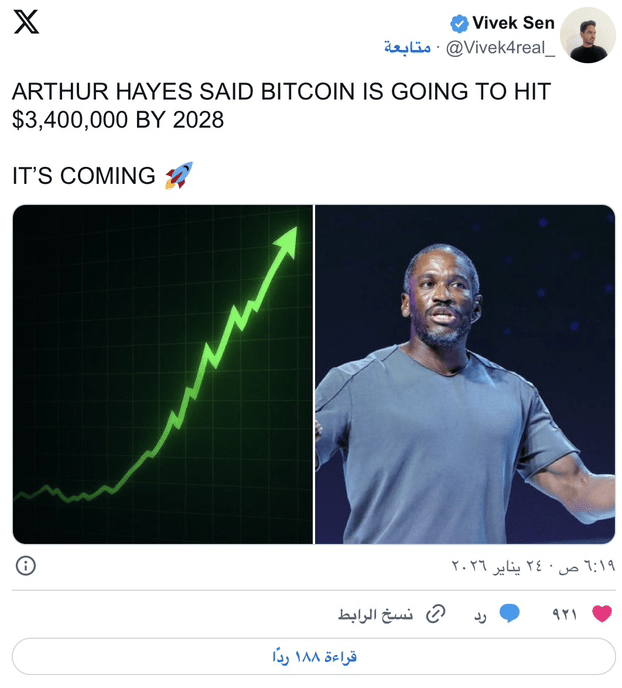 Arthur Hayes a déclaré publiquement que $BTC atteindra 3,4 millions de dollars d'ici 2028. Cela a été dit dans le contexte de sa discussion sur l'avenir des conditions de liquidité mondiales. Hayes a lié le potentiel du Bitcoin aux politiques économiques macroéconomiques, indiquant que les gouvernements continuent d'élargir le crédit. Il estime que les systèmes financiers traditionnels poussent les investisseurs vers des actifs alternatifs. Selon son estimation, le Bitcoin représente le meilleur moyen de couverture contre l'érosion à long terme de la valeur des monnaies. Il a formulé cette prévision dans le cadre de tendances systémiques générales, et non comme une spéculation à court terme.