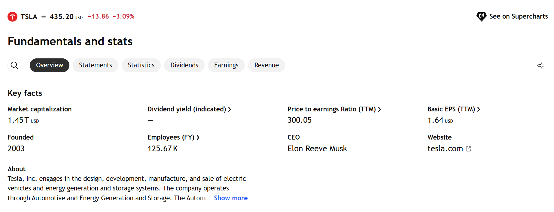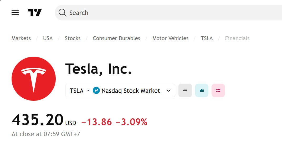 🚀À la dernière fermeture du marché, Tesla (TSLA) se négociait à 435,20 $, en baisse de 3,09 % sur la journée, avec une capitalisation boursière d'environ 1,45 trillion de dollars—une échelle qui place Tesla parmi les actifs négociables les plus influents au monde.