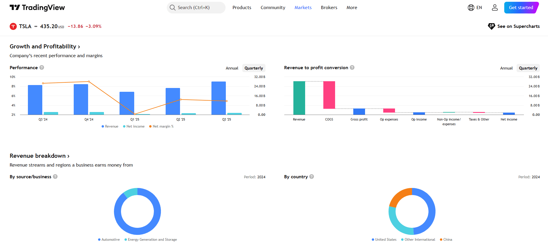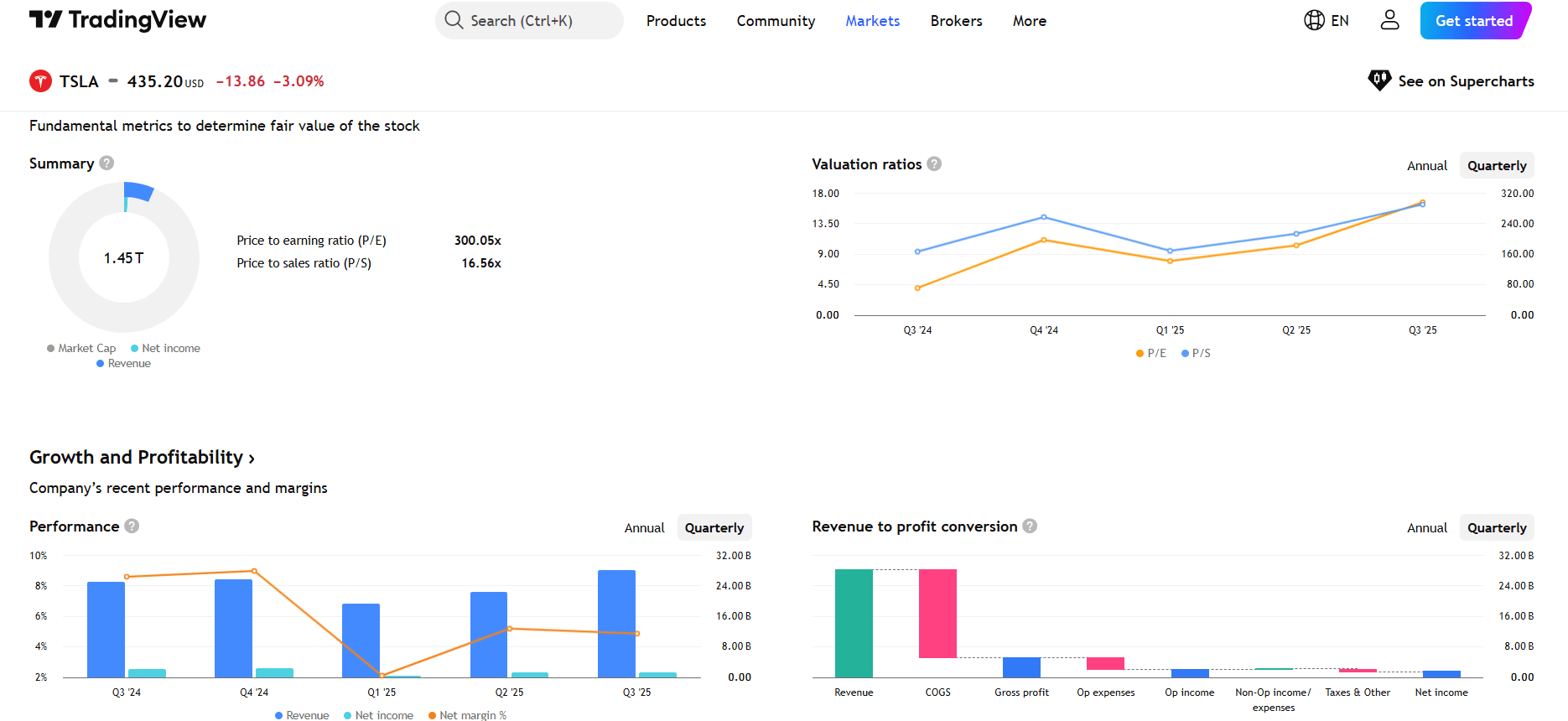 D'un point de vue valorisation, Tesla reste un actif à haute attente. L'action se négocie actuellement à un ratio cours/bénéfice (TTM) d'environ 300x, avec un BPA de 1,64 $, signalant que les investisseurs intègrent une forte croissance à long terme plutôt qu'une rentabilité à court terme.