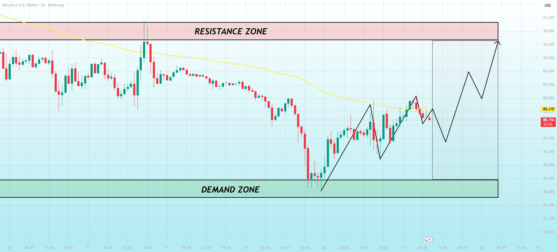 Le Bitcoin se contracte actuellement après une vente sévère, maintenant sa force au-dessus d'une zone de demande bien définie, tandis que le prix continue de former des creux plus élevés dans un cadre de moyenne mobile descendante. Cette structure indique une absorption et un accumulation, et non une vente de panique. Les vendeurs échouent à ramener le prix à la demande, tandis que les acheteurs entrent tôt à chaque baisse, ce qui est un signe classique d'accumulation de pression avant l'expansion.