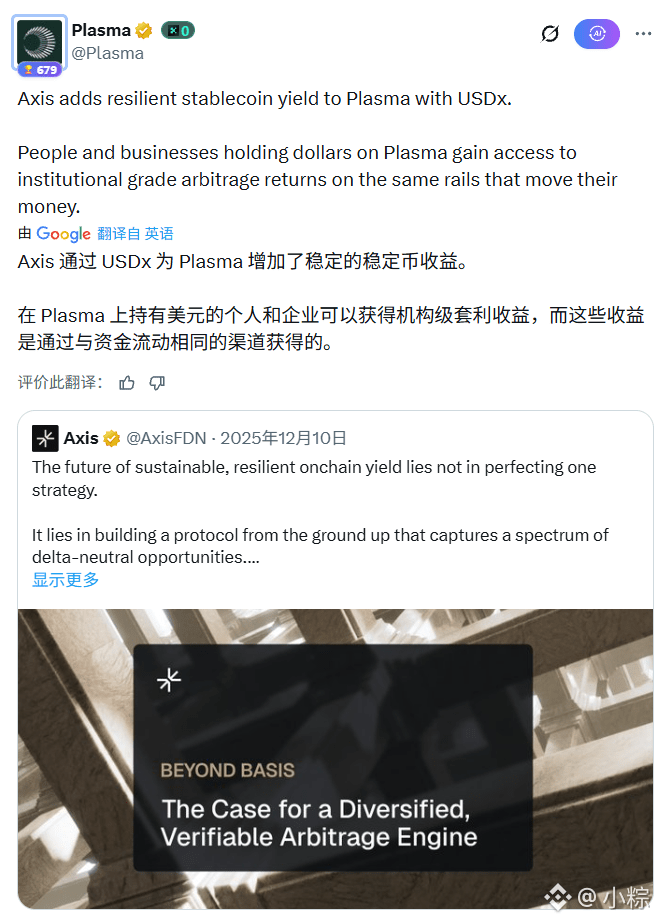 Plasma发布X帖子,宣布通过Axis项目USDx引入弹性稳定收益机制