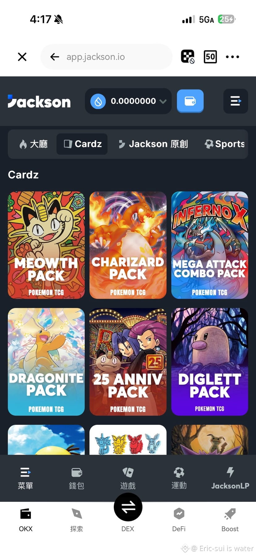 用 USDC、$SUI 或 $JACKSON 充值。左侧导航直达 Cardz.game 模块,这里陈列各种宝可梦卡包——从入门级到高稀有度限量包,应有尽有。