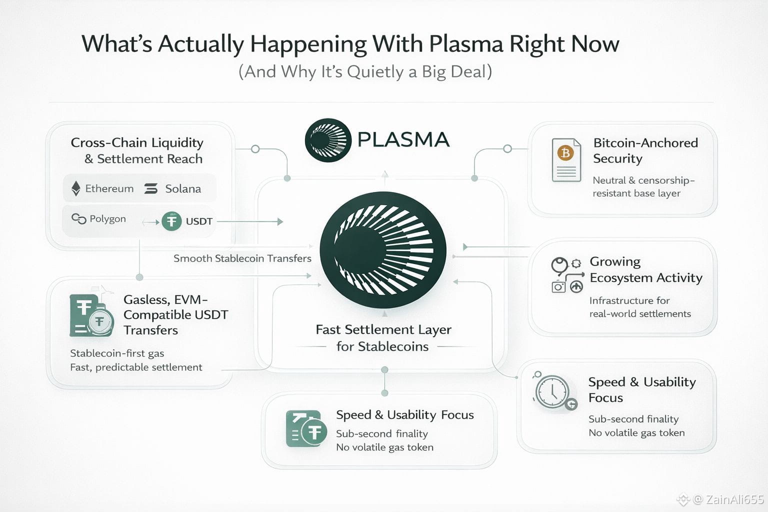 One of the more important recent moves is Plasma expanding its cross-chain liquidity and settlement reach. In practical terms, this means stablecoins like USDT can move between Plasma and other ecosystems more smoothly, without fragile bridges or clunky handoffs. Liquidity isn’t trapped. It flows. For a settlement-focused chain, that’s non-negotiable. You can’t be the place where money settles if money can’t easily get in and out.