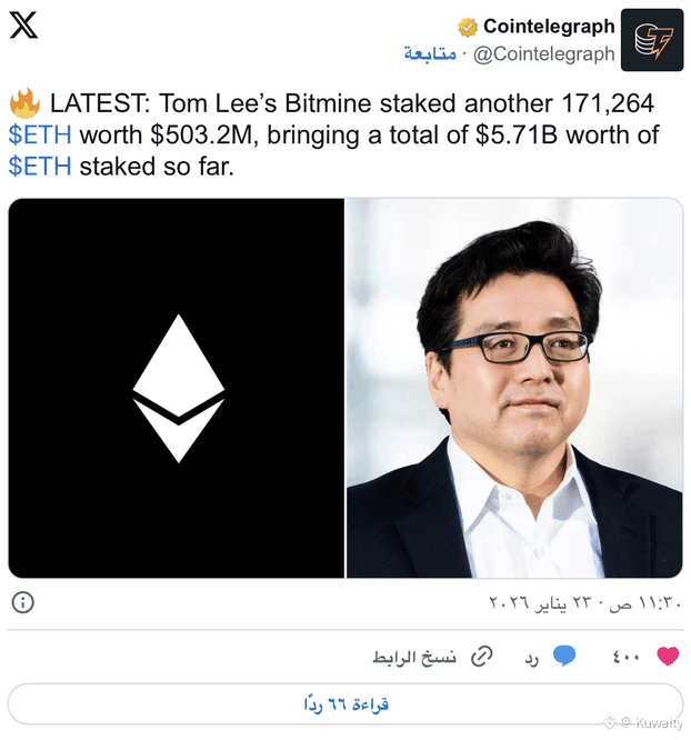 تواصل عمليات الستاكينغ على إيثيريوم التي تنفذها شركة BitMine التسارع، بينما تعمّق مشروع توم لي في العملات الرقمية استراتيجيته طويلة الأجل على $ETH . قامت الشركة مؤخرًا بستاكينغ 171,264 ETH إضافية، بقيمة تقارب 503.2 مليون دولار. هذا التحرك رفع إجمالي حيازات BitMine من إيثيريوم الستاكينغ إلى 5.71 مليار دولار.
