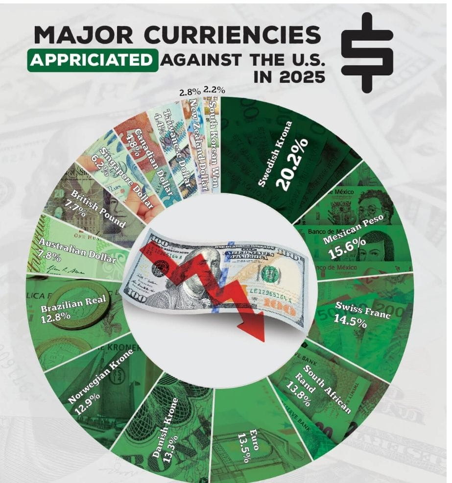 In 2025, nearly every major global currency appreciated against the U.S. dollar.