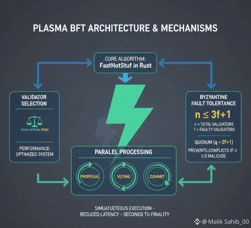 • Plasma PFT Architecture and Mechanisms: Core Algorithm: Plasma PFT is a high-performance implementation of the FastHotStuff consensus algorithm, written in Rust. Parallel Processing: Unlike traditional sequential consensus, Plasma parallelizes and executes the proposal, voting, and commit processes simultaneously. This architecture reduces latency, enabling block finality to be achieved within seconds. Byzantine Fault Tolerance: The network operates under the condition of `n ≥ 3f+1`, where `n` is the total number of validators and `f` is the number of ignored or defective validators. The validation process requires a quorum (q = 2f+1), ensuring that two conflicting blocks are not completed unless more than one-third of the validators act maliciously. Validator Selection: Validator selection is managed by a performance-optimized Proof-of-Stake (PoS) system.