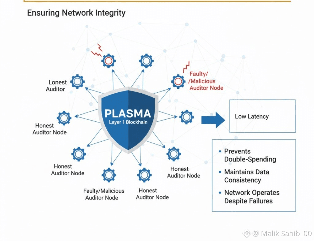 Byzantine Fault Tolerance (BFT) Background: Byzantine fault tolerance refers to the ability of a decentralized system to continue operating even if some nodes fail or engage in malicious activity. In the context of Plasma, this ensures the network maintains its integrity, prevents double-spending, and allows the network to continue operating even if some auditors act dishonestly.