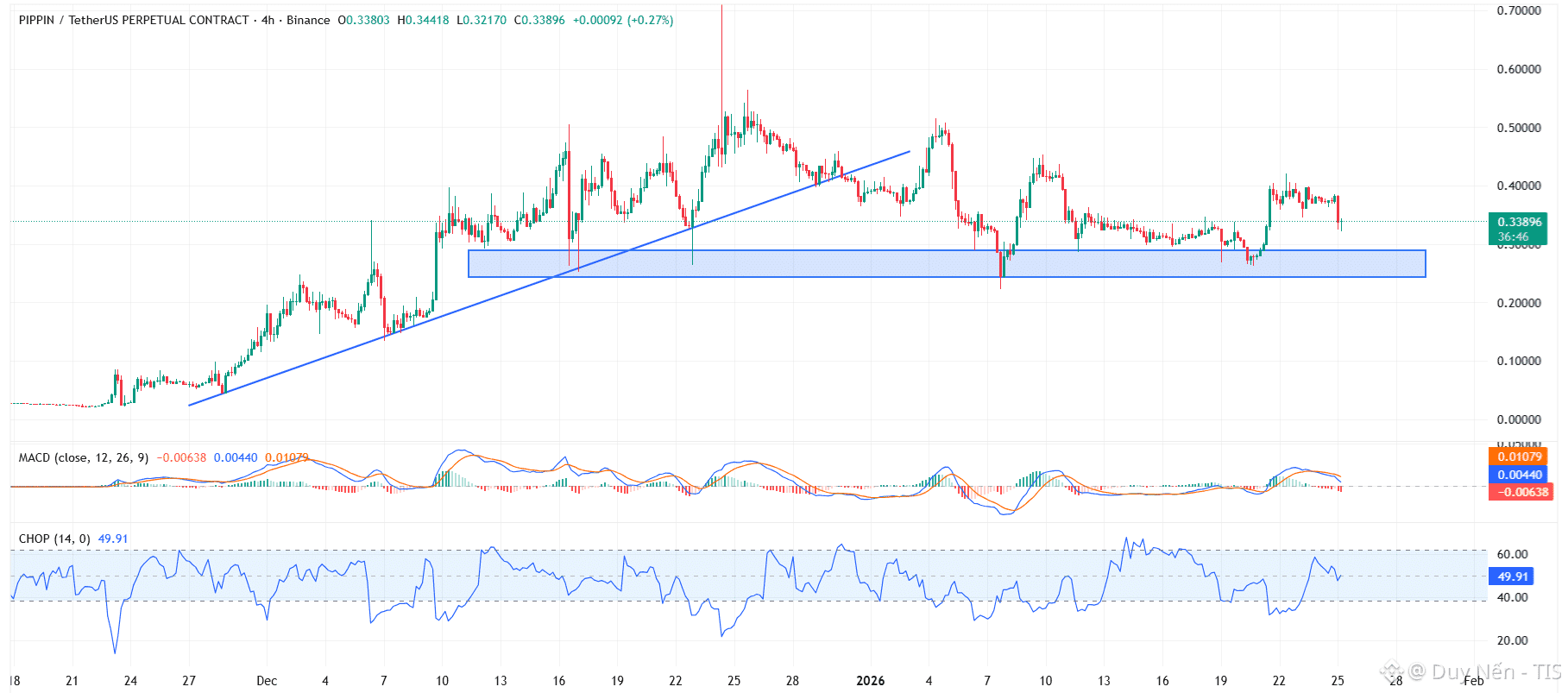 PIPPIN đang di chuyển cực kỳ khó chịu sau khi mất mốc đỉnh $0.70 và gãy xu hướng tăng. Chỉ số Choppiness đạt 49 cho thấy giá đang chưa rõ xu hướng, cứ dập dìu trong biên độ hẹp.
