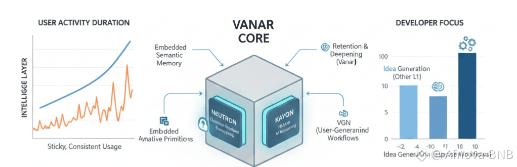 The next layer of analysis is where intelligence actually resides. Most chains treat AI as an externality APIs, off-chain inference, oracle-style integrations. Vanar takes a different approach. Components like Neutron and Kayon aren’t optional extensions they’re structural constraints. That matters. When intelligence is native, execution stops being the scarce resource. Interpretation becomes the bottleneck. At that point, traditional metrics like TPS lose relevance. What I care about instead is whether workflows deepen over time rather than reset.