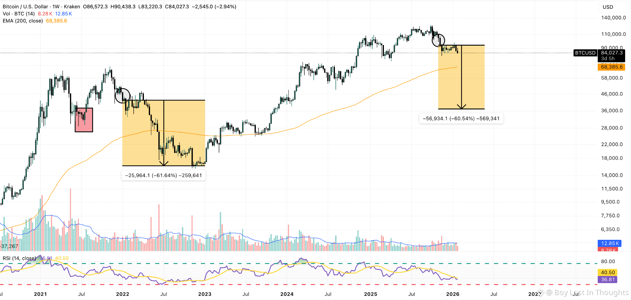 Breakdown below the 50-week EMA suggests potential for a deeper long-term correction to $36,000, echoing the 2021 bear market structure.