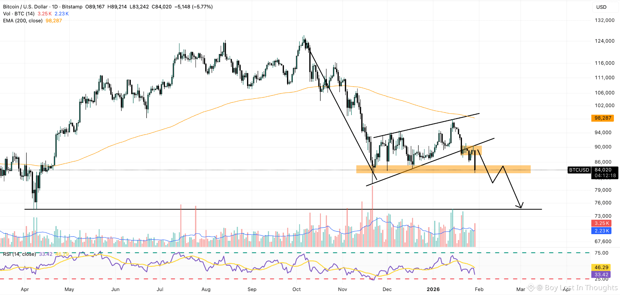 A confirmed bear flag pattern points to a near-term drop toward $74,000.
