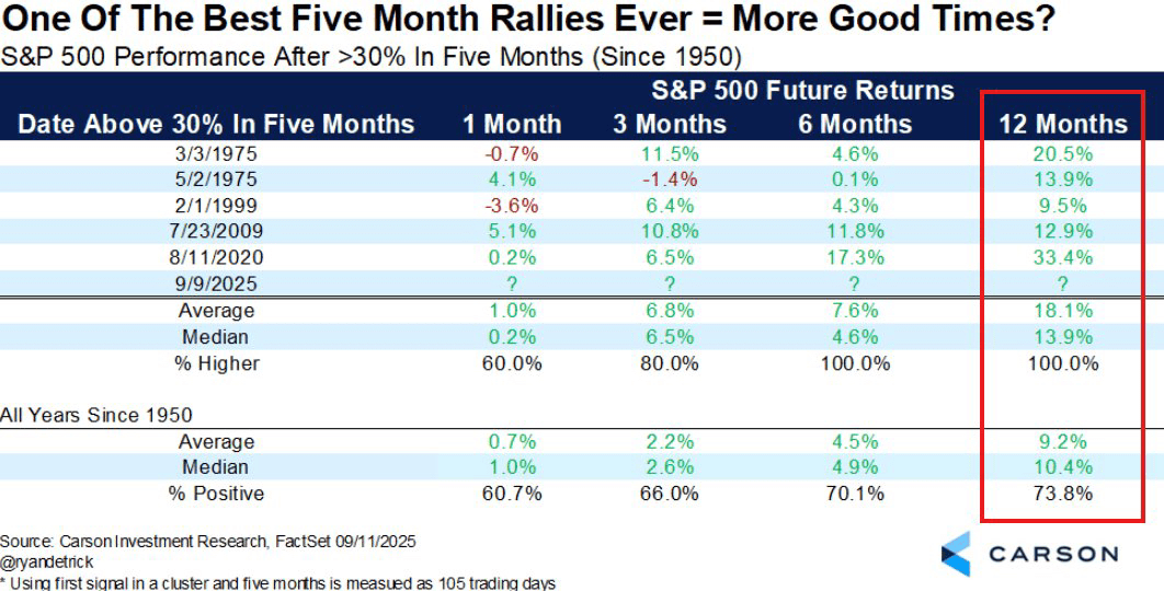 Dalam 5 kali sebelumnya S&P 500 reli 30%+ dalam 5 bulan, 12 bulan berikutnya SELALU hijau.