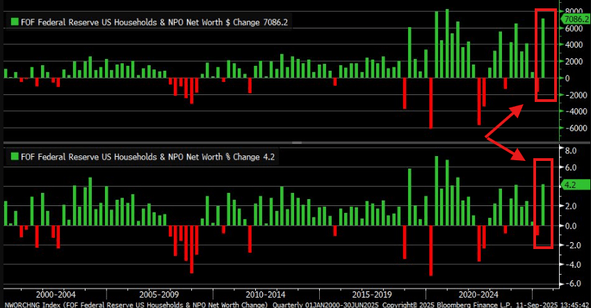 Data yang baru dirilis menunjukkan bahwa kekayaan bersih rumah tangga AS melonjak sebesar +$7,1 TRILIUN hanya di Q2 2025.