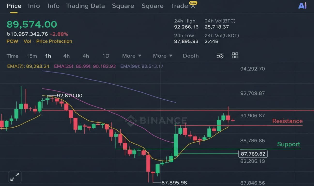BTC turun tajam ke $87,895, tetapi kembali naik. Kenapa? Karena beberapa orang masih percaya bahwa penurunan adalah kesempatan untuk membeli. Pemulihan ke $89,572 menunjukkan ada pembeli di bawah $88K.