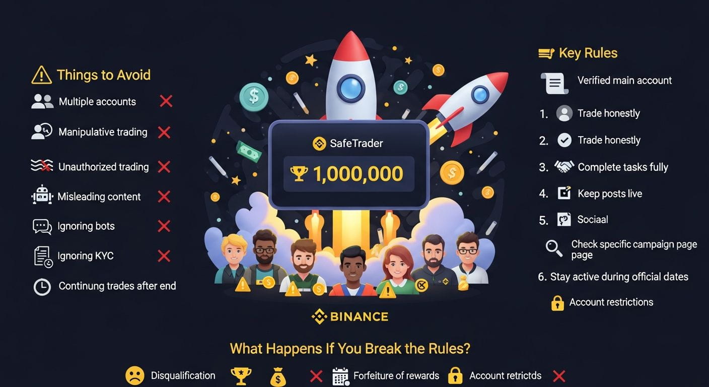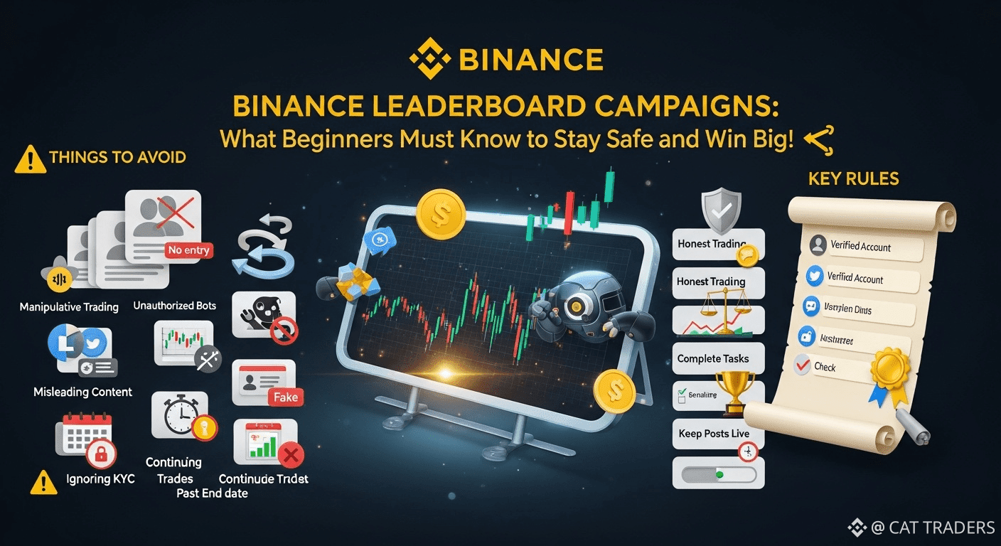 Binance leaderboard campaigns are exciting contests where traders compete in spot, futures, or other trading activities to rank high and win rewards like tokens or BNB. Many beginners join to test their skills and earn prizes, but breaking the rules can ruin everything. Here is a simple guide on what to avoid, the main rules, and what happens if you break them.