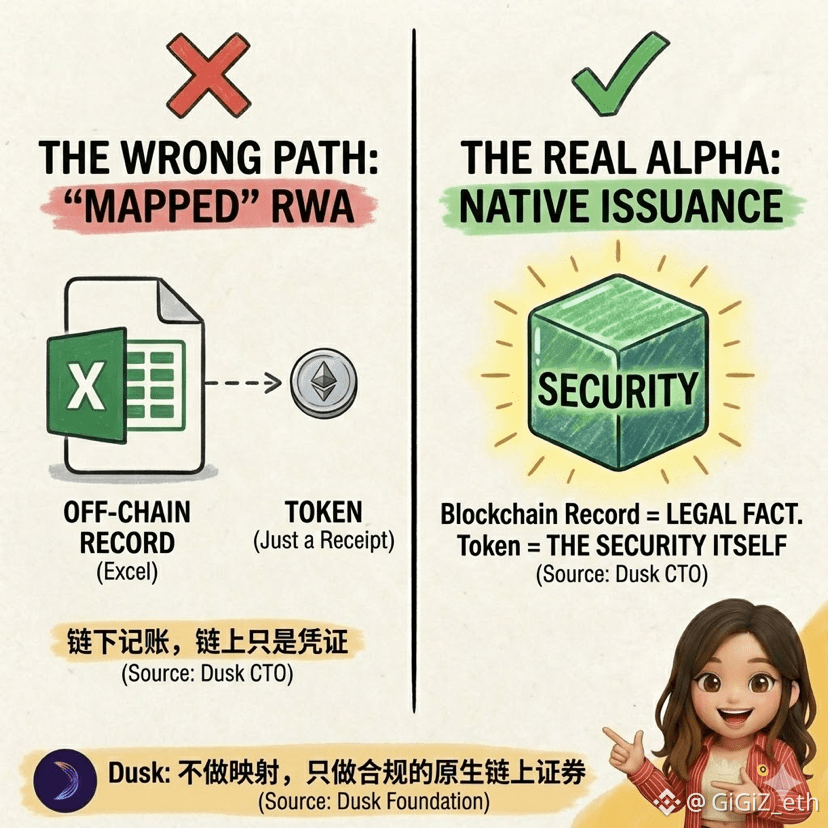 花旗银行在《重新构想欧洲资本市场》中指出一个痛点:欧洲市场碎片化, 29 个市场、36 个中央证券存管机构,导致欧洲的结算费用比北美高 65%,托管费高出 500%。为了解决成本问题,很多人鼓吹代币化,但 Dusk CTO Hein 指出真相: 大多数 RWA 项目,资产所有权依然躺在链下的 Excel 表格里,链上的 Token 仅仅是一个收据或索赔权, 就像你有一张电子购车发票,但车管所的登记名字还不是你