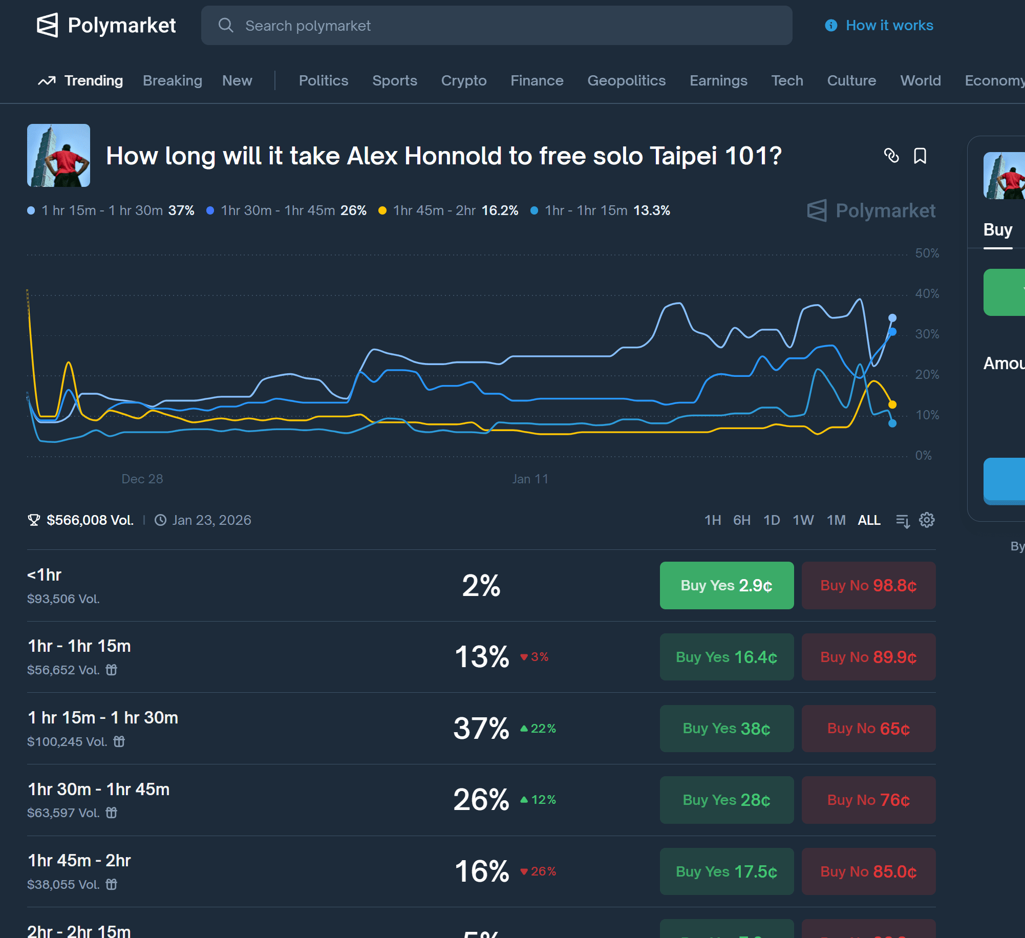 Per 21 Januari, total volume perdagangan di pasar telah melebihi $310.000. Hasil yang paling populer—didukung oleh 37% peserta—memprediksi bahwa Alex Honnold akan menyelesaikan pendakian dalam waktu 1 jam 15 menit hingga 1 jam 30 menit. Jendela kedua yang paling disukai adalah 1 jam 30 menit hingga 1 jam 45 menit, yang menyumbang 20% dari taruhan.