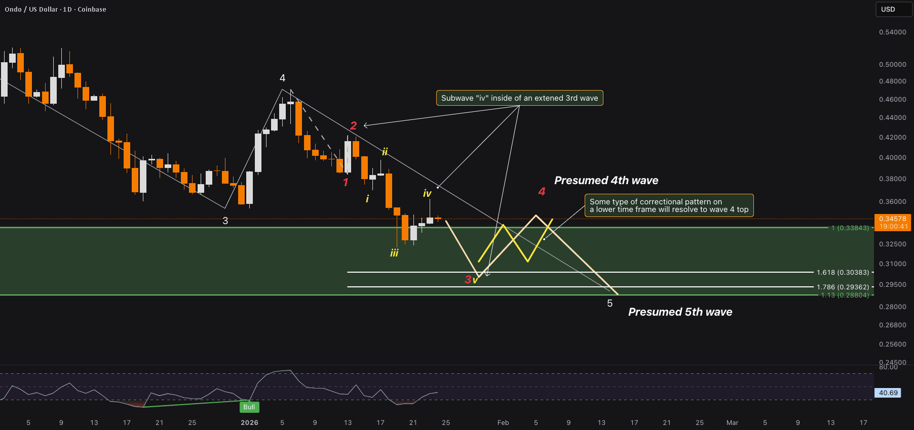 ONDO Berpotensi mencetak sub-gelombang 5 dari gelombang ke-3 yang diperpanjang dari satu tingkatan yang lebih tinggi. Ini menunjukkan rendah yang lebih rendah untuk ONDO. Ini juga menandakan bahwa gelombang impulsif ke-5 dari tingkatan yang bahkan lebih tinggi belum hadir. Ambil kunci: Harga masih impulsif ke arah bawah.