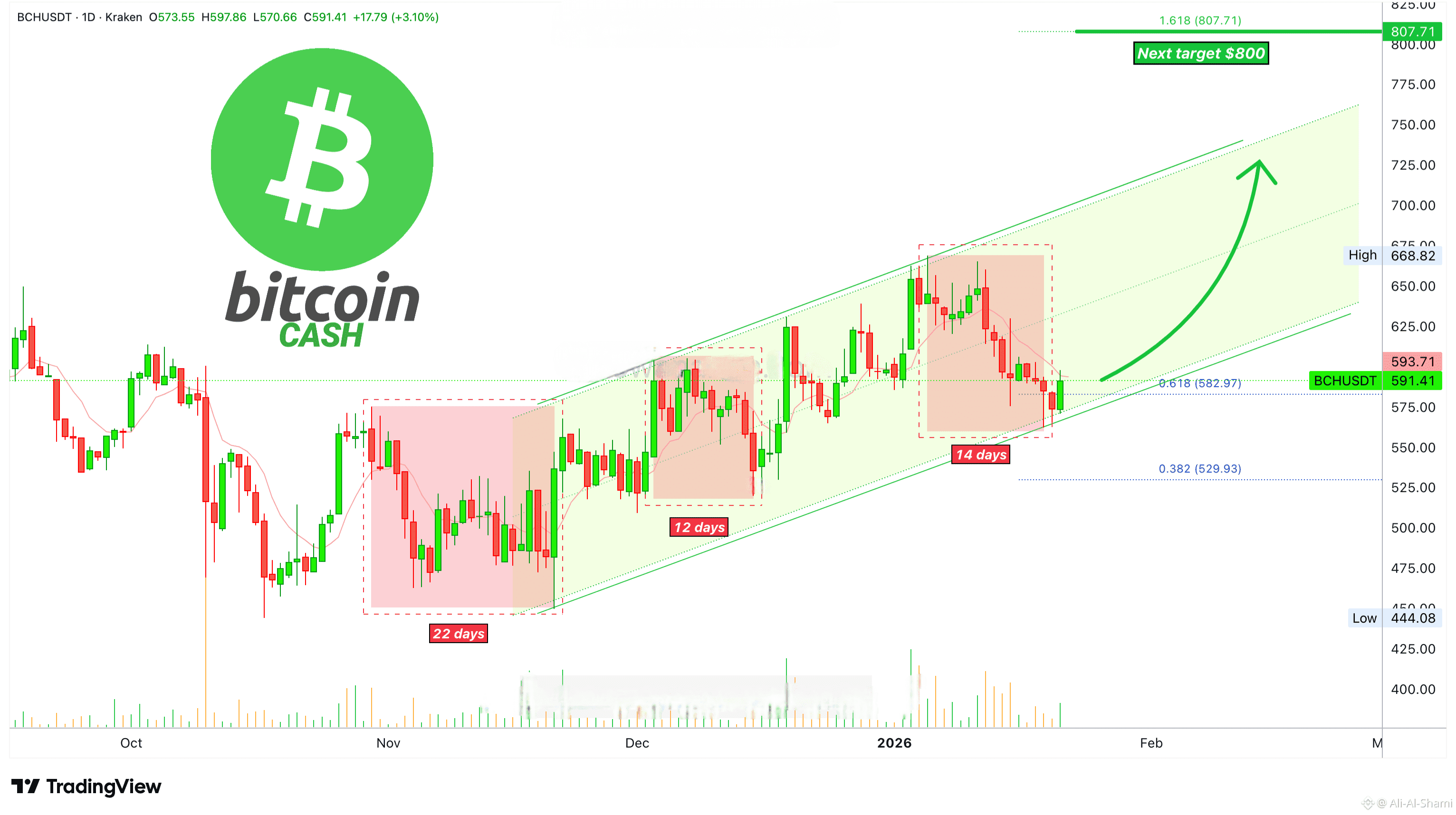 كانت بيتكوين كاش تنتج تراجعات بينما تتحرك ضمن قناة صاعدة، وهذا أمر قياسي. بعد بعض النمو، هناك دائمًا تراجع. "السوق لا يتحرك أبدًا بشكل مستقيم للأسفل أو للأعلى، بل يميل إلى التقلب."