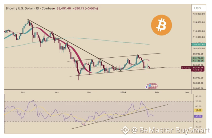 👉 Bitcoin is hovering near a crucial support trendline on the daily chart that's been holding since late November 2025. Trading around $88,000-$89,000 after a sustained pullback, BTC is sitting at a technically sensitive spot where things could go either way. The chart shows price squeezed between descending resistance above and rising support below, creating a tightening range that typically resolves with a stronger directional move.