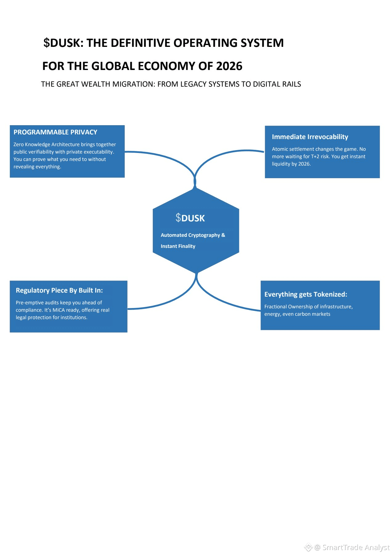 $DUSK is not simply about "moving money"; it represents a programmable world in which the Rules of Law are as immutable as the Rules of Math. And by automating away human intermediaries, it gives rise to a "frictionless" economy wherein assets move as easily as an email, but remain as secure as a central bank vault.