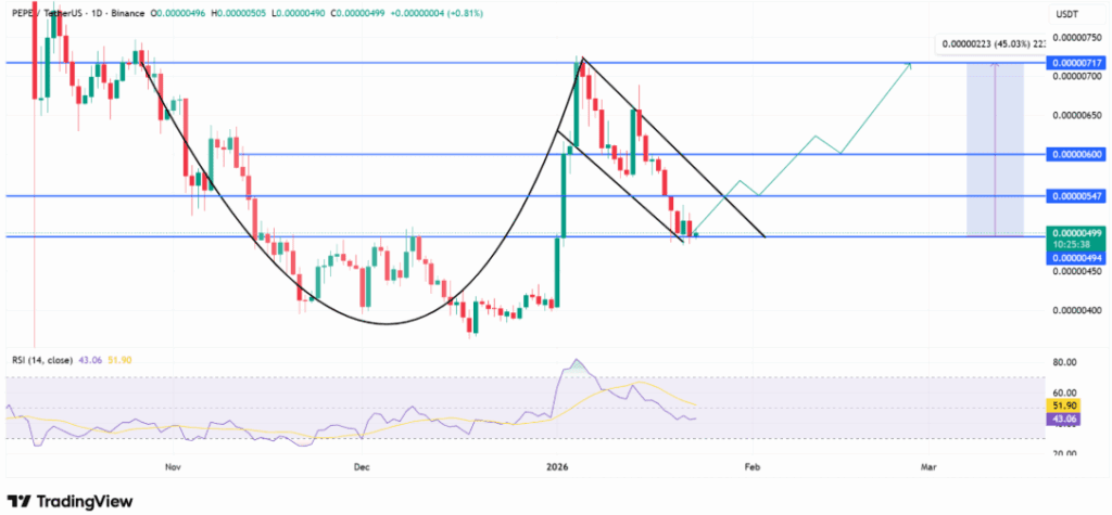 Formasi Cup and Handle menetapkan panggung untuk breakout, dengan target mendekati $0.00000600 dan $0.00000717.