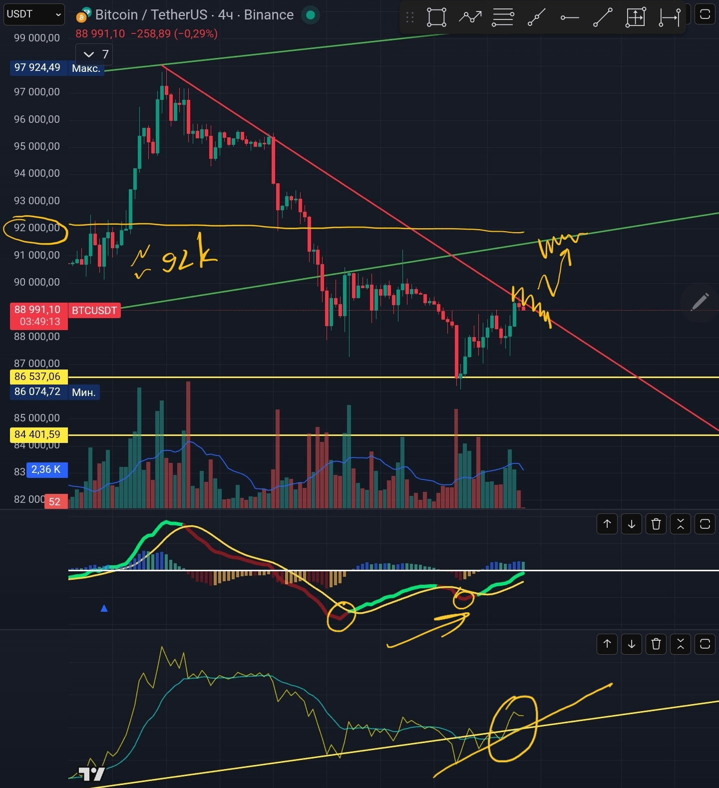 Di grafik empat jam, dilihat kelanjutan divergensi bullish, seperti yang kita bicarakan, garis turun (merah) akan diuji kekuatannya. Jika tembus, garis ini akan membuka jalan menuju garis dukungan sebelumnya dari garis resistensi saat ini, level kira-kira 92k. Juga perhatikan indikator volume, ia telah menembus garis turunannya, sering kali ia memprediksi arah yang benar dan kemungkinan pelanggaran garis turun di grafik.