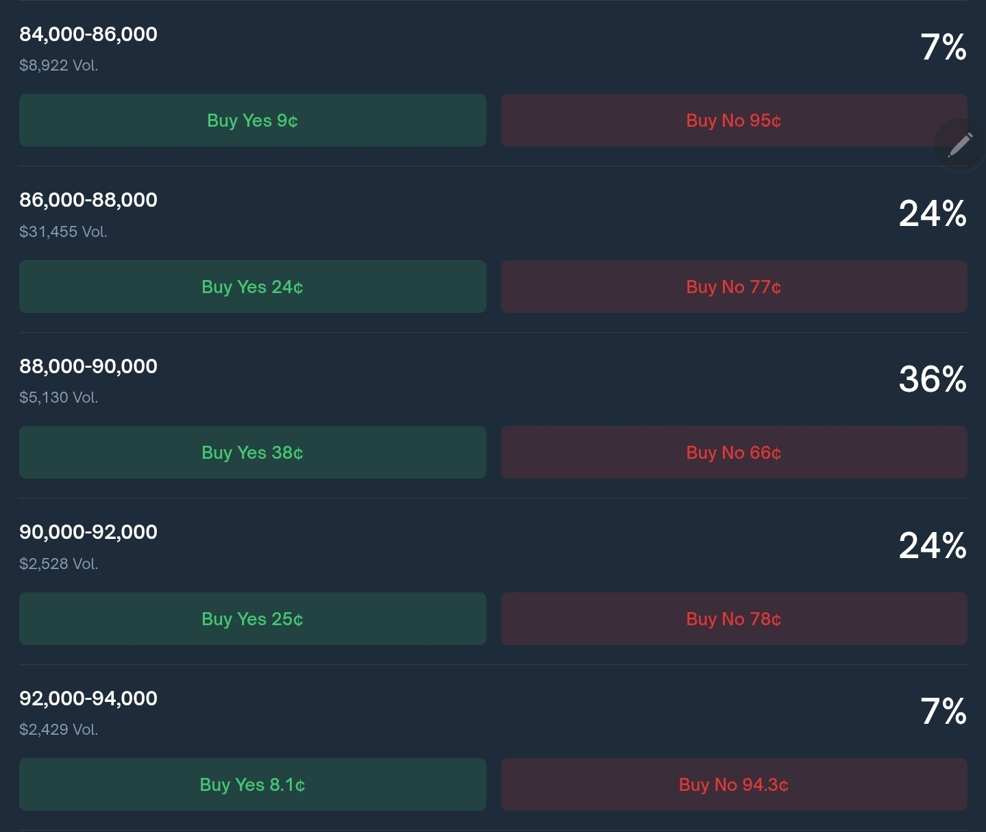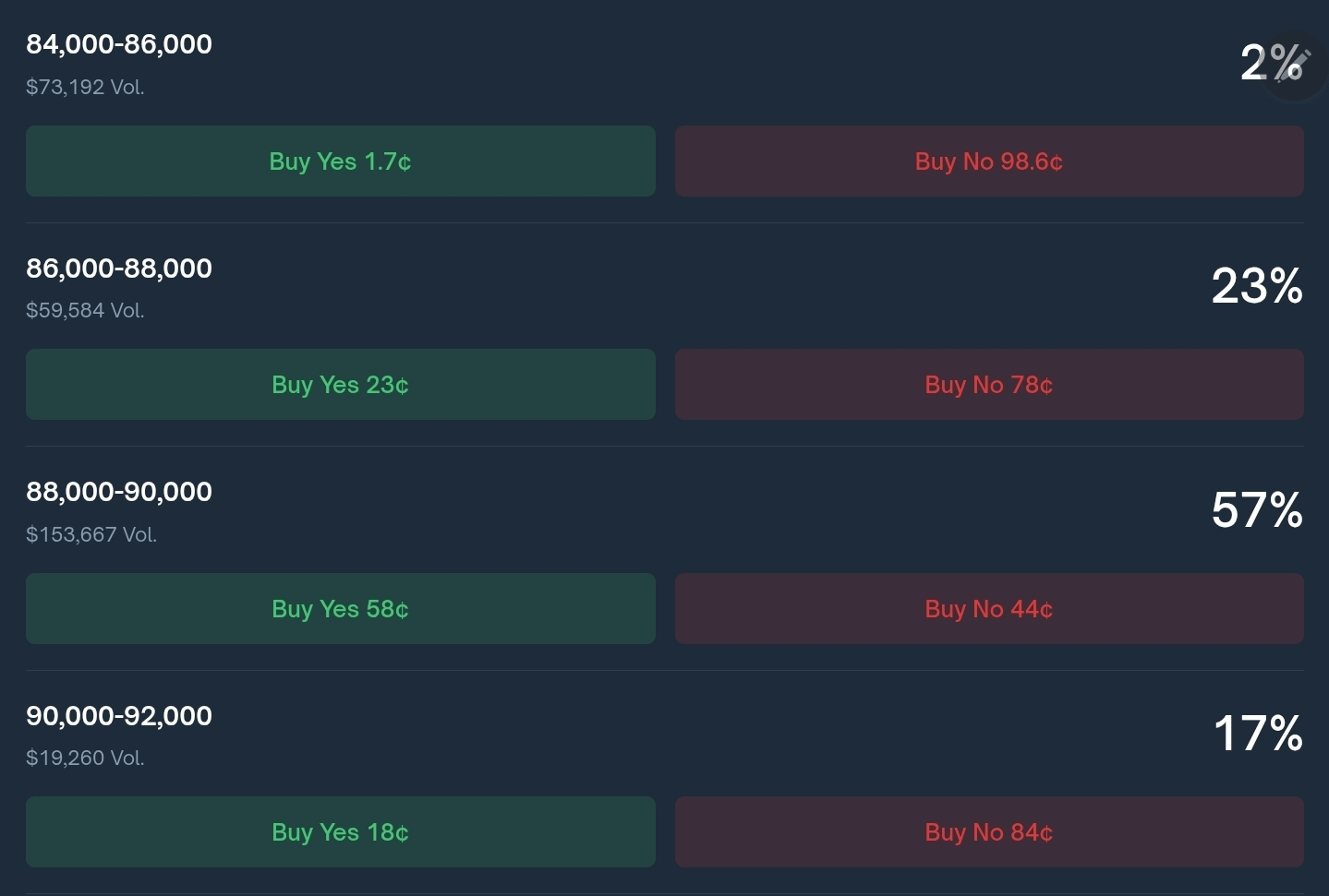 📍Proyeksi mayoritas di Polymarket untuk hari ini dan hari besok memberikan rentang harga yang paling mungkin 88-90k