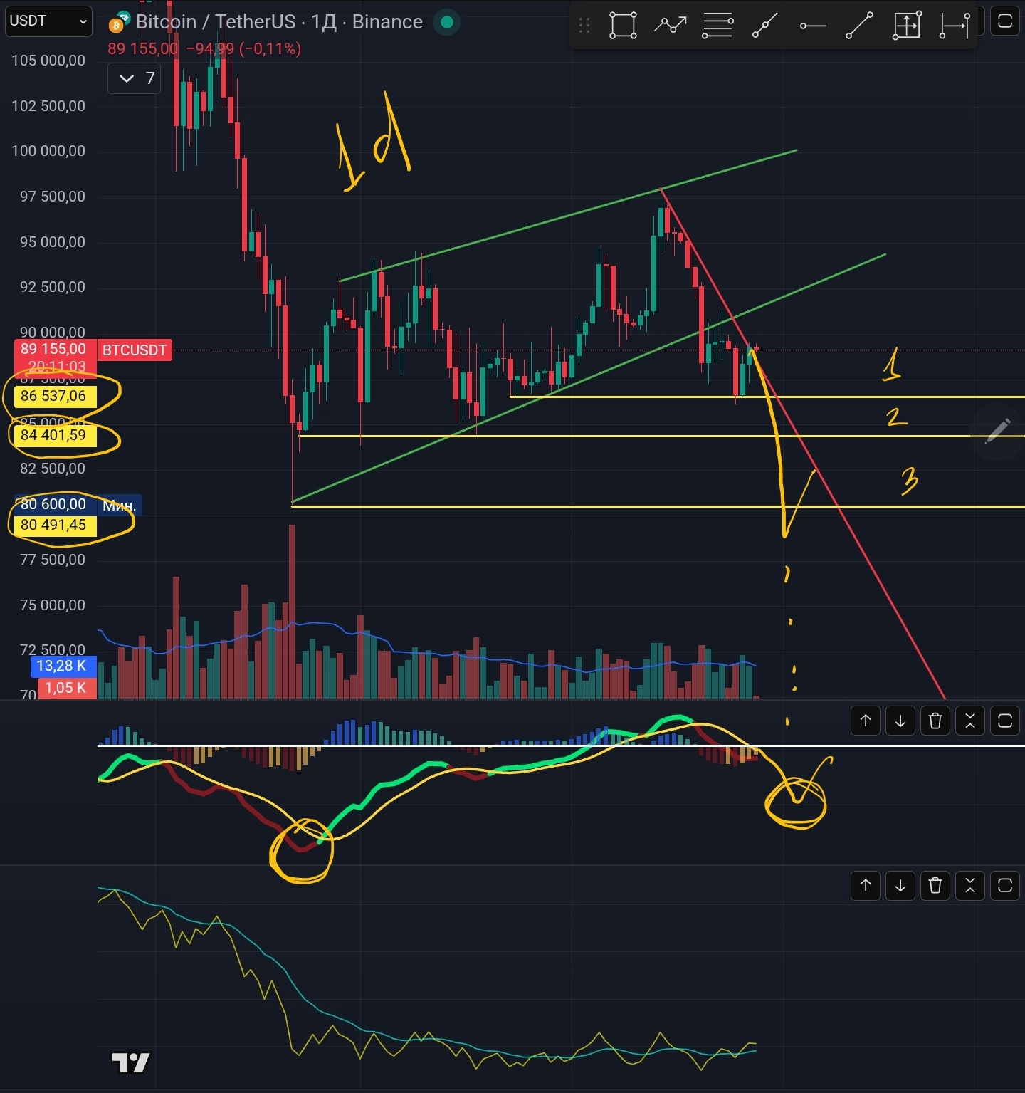 $BTC Selamat pagi teman-teman tercinta! Di grafik harian, kita dapat melihat tiga level dukungan harga, dari masing-masing mungkin ada reaksi. Di gambar, saya menggambar skenario ideal dari apa yang saya harapkan dari harga, penembusan harga di bawah minimum sebelumnya 80.6k dengan divergensi bullish yang jelas. Tapi seperti saya, semua orang melihat skenario ideal dan oleh karena itu akan berbeda dari harapan