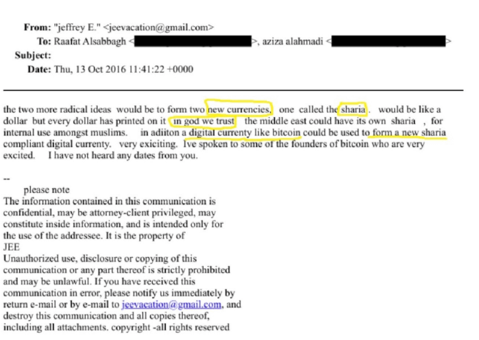 Pada tahun 2018 Epstein mengirim email kepada Steve Bannon menanyakan bagaimana pajak crypto bekerja.