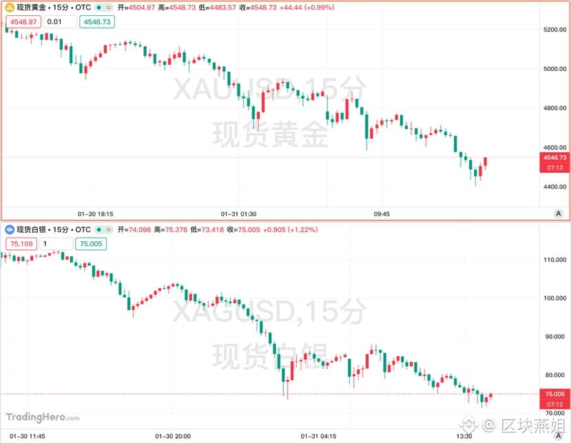 贵金属的史诗级暴跌噩梦延续到新的一周。周一,现货金银暴跌,现货黄金一度逼近4400美元/盎司关口;现货白银一度失守72美元/盎司,接近抹去年内涨幅,日内重挫逾15%。截至发稿,金银跌幅均有所缩窄。