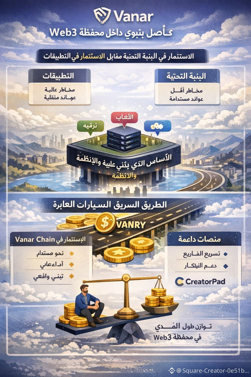 عند بناء محفظة استثمارية في عالم Web3، يقع الكثير من المستثمرين في فخ التركيز على التطبيقات والمنتجات النهائية، بينما يتم تجاهل الطبقة الأهم: البنية التحتية. تاريخيًا، في كل دورة تقنية كبرى، كانت القيمة طويلة المدى تتراكم في الطبقات التي تُبنى عليها الأنظمة، وليس فقط في الواجهات التي يراها المستخدم. من هذا المنطلق، يمكن النظر إلى Vanar Chain ليس كمشروع عابر، بل كأصل بنيوي داخل محفظة Web3 متوازنة.