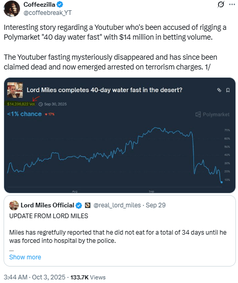 L'investigatore di criptovalute Coffeezilla sostiene che Lord Miles abbia segretamente scommesso contro se stesso su Polymarket. Secondo le prove condivise, l'influencer avrebbe trasferito fondi su un conto in cui era stata piazzata una scommessa "No" alla sfida del digiuno, incassando oltre 60.000 dollari di profitti.