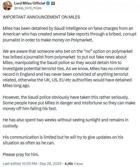 Lord Miles ha iniziato il suo digiuno ad acqua di 40 giorni mentre trasmetteva aggiornamenti in diretta da una tenda nel deserto. La sua improvvisa scomparsa dai social media a fine settembre ha scatenato il panico: molti hanno pensato che fosse morto. Le voci si sono intensificate quando si è scoperto che era entrato in coma, era stato ricoverato in ospedale e successivamente arrestato dalle autorità saudite con vaghe accuse di terrorismo.