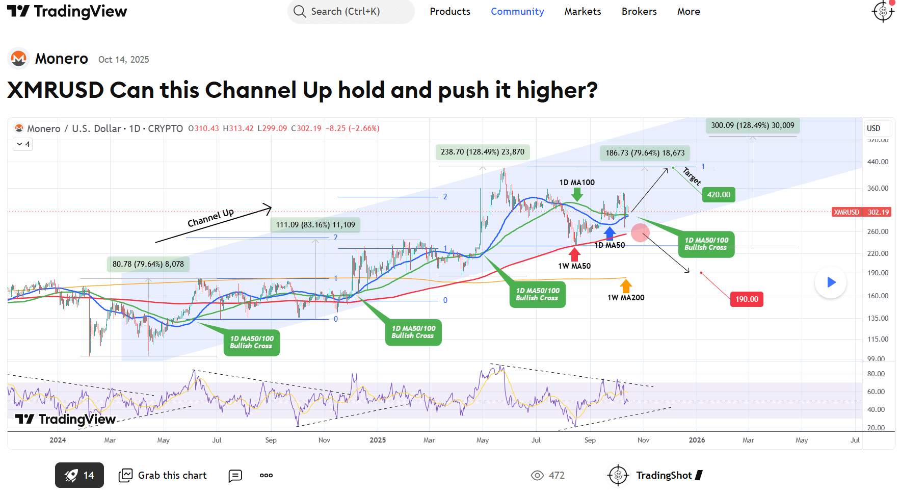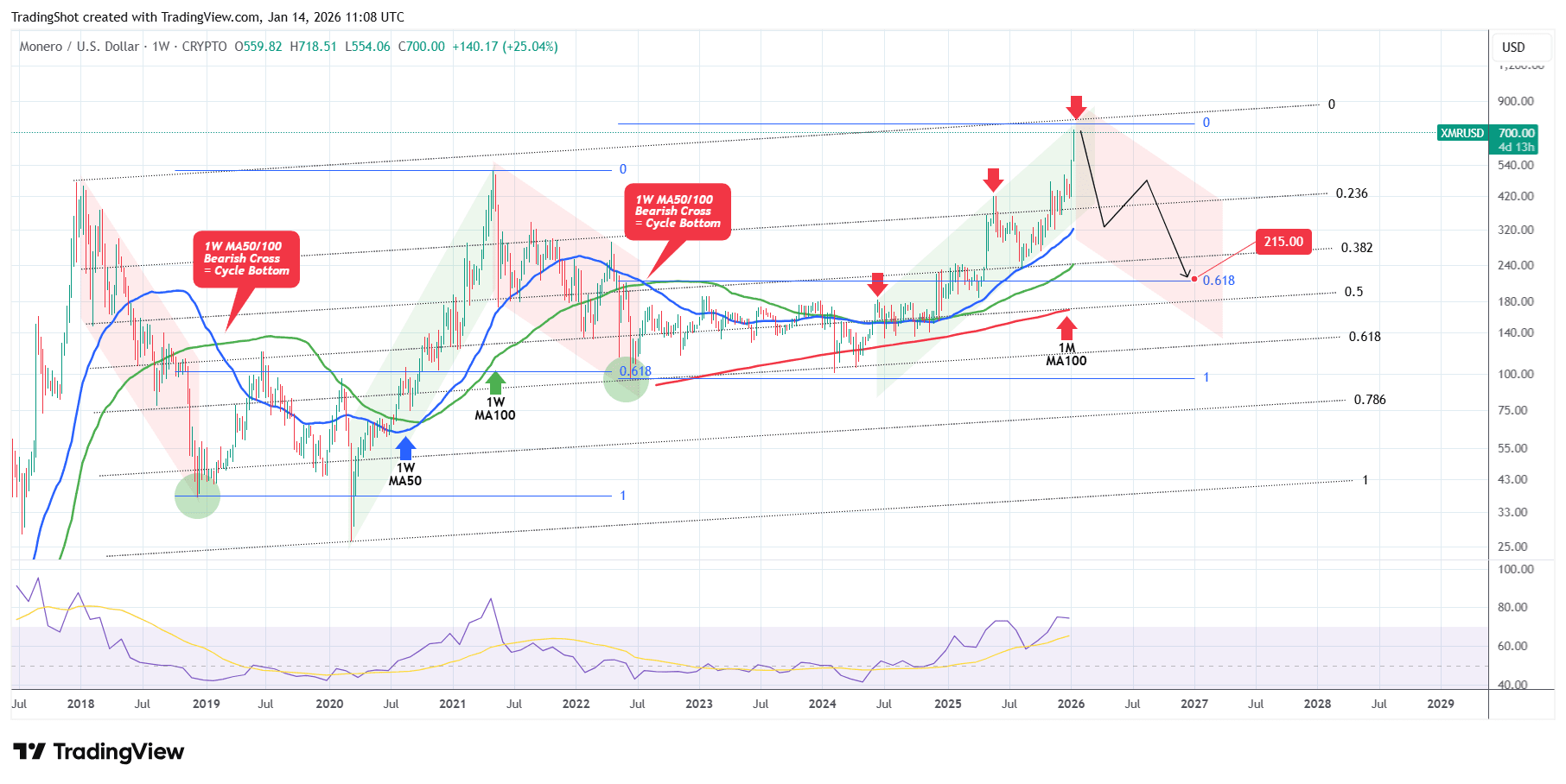 L'ultima volta che abbiamo analizzato Monero (XMRUSD) era esattamente 3 mesi fa (14 ottobre 2025, vedi grafico qui sotto), dando un segnale di acquisto al fondo del canale in salita a lungo termine, che ha rapidamente raggiunto il nostro obiettivo: