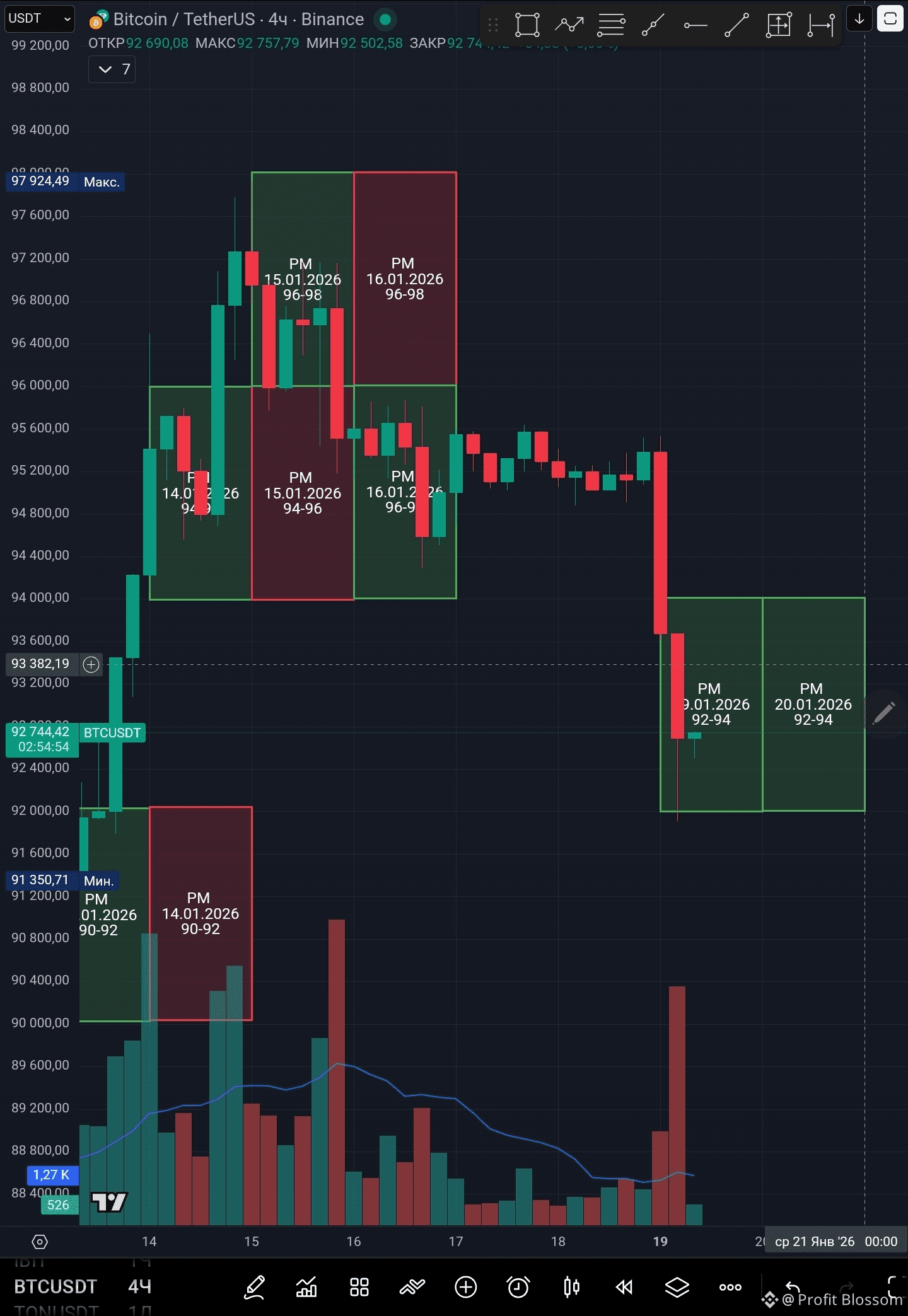 📍Прогноз большинства в Polymarket на сегодняшний и на завтрашний день даёт нам наиболее вероятный разброс цен 92-94k